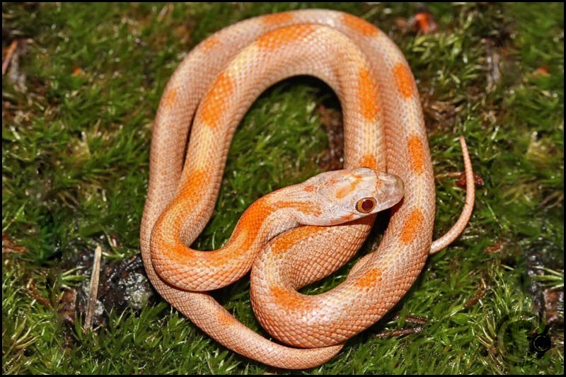 Wie der Name nahelegt, ist die Hypo Toffee Bloodred Striped die Kombination aus dem rezessiven Farbgen Hypomelanistic, dem dominanten Farbgen Toffee und den rezessiven Zeichnungsgenen Bloodred und Striped. |